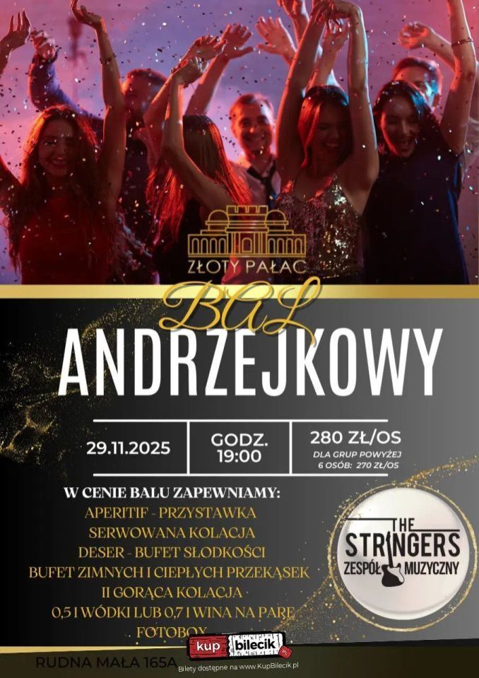 Już 29 listopada 2025 roku o godzinie 19:00 zapraszamy na niezapomniany wieczór pełen magii, muzyki i doskonałej zabawy! Niech ta andrzejkowa noc w Złotym Pałacu będzie pełna radości, tańca i wyjątkowych wspomnień! Bilety do nabycia na: KupBilecik.pl