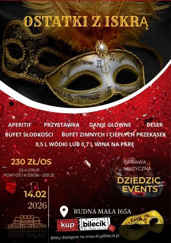 Zapraszamy na wyjątkowe Ostatki. Czeka na Was noc pełna tańca, wyśmienitego jedzenia i karnawałowej atmosfery. Pożegnajmy karnawał z klasą, blaskiem i… iskrą! Bilety do nabycia na: KupBilecik.pl