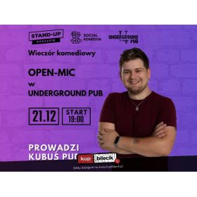 |   Open-mic w Underground Pub | Prowadzi: Kubuś Pudłododano 2025-10-31 11:14:32  Już 21. grudnia Stand-up Rzeszów wraca z wieczorem świeżych żartów. To okazja, by sprawdzić, jak rodzi się komedia na Podkarpaciu. Gwarantowane niemal dwie godziny śmiechu oraz chaosu. Na naszej scenie pojawią się zarówno komicy doświadczeni, jak i ludzie rozpoczynający swoją przygodę z mikrofonem. Całość poprowadzi laureat programu "Masz minutę" - Kubuś Pudło. Stand-Up Rzeszów artyści: Komicy i stand-uperzyNajlepsi komicy w kraju na scenie Klubu Muzycznego Life House w Rzeszowie. Stand-up, a także improwizacje komediowe na najwyższym poziomie. Bilety do nabycia na: KupBilecik.pl   |